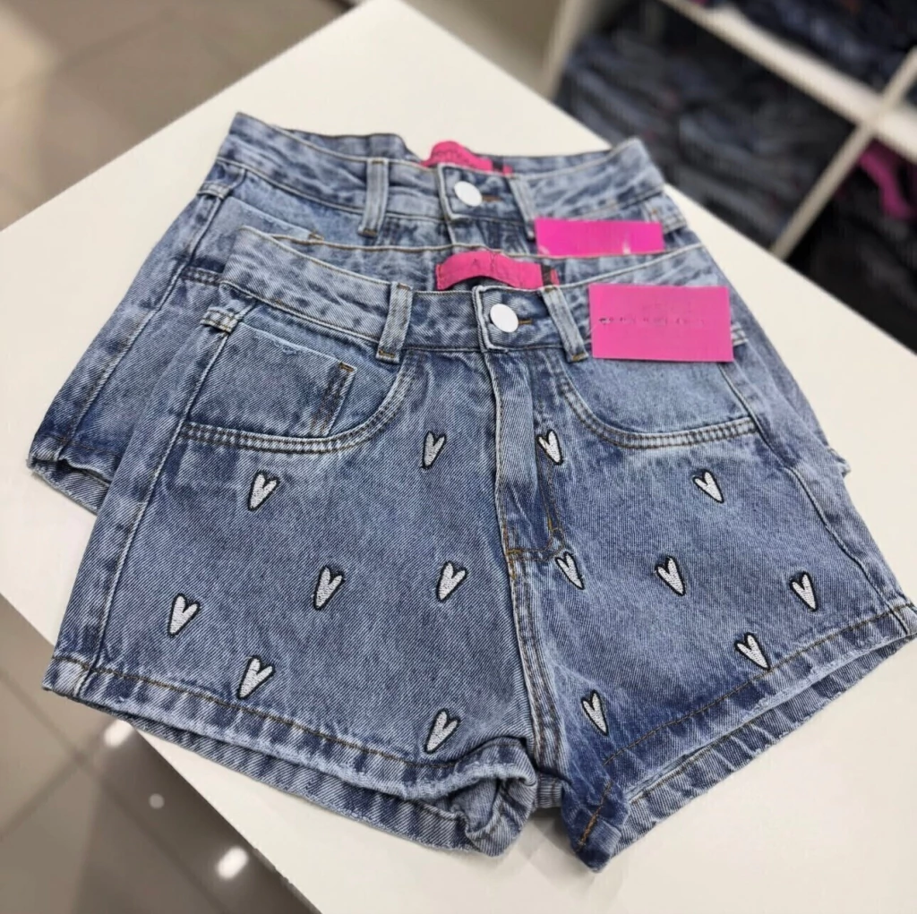Charmoso e cheio de personalidade, esse short jeans possui bordados de coração, lavagem intermediária e fechamento em zíper e botão. Veste na forma normal, garantindo caimento confortável e fiel ao tamanho. Disponível na grade 34 ao 44.